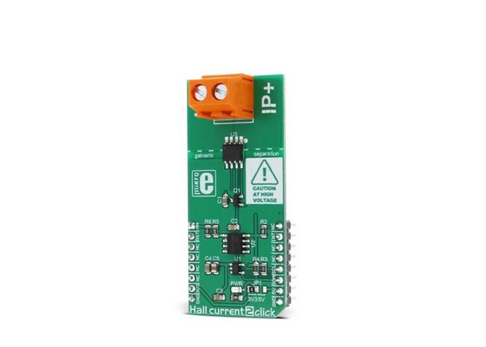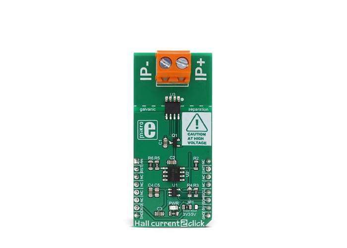 The onboard SMD jumper allows selection between 3.3V and 5V. This allows both 3.3V and 5V MCUs to communicate with the Hall current 2 Click.