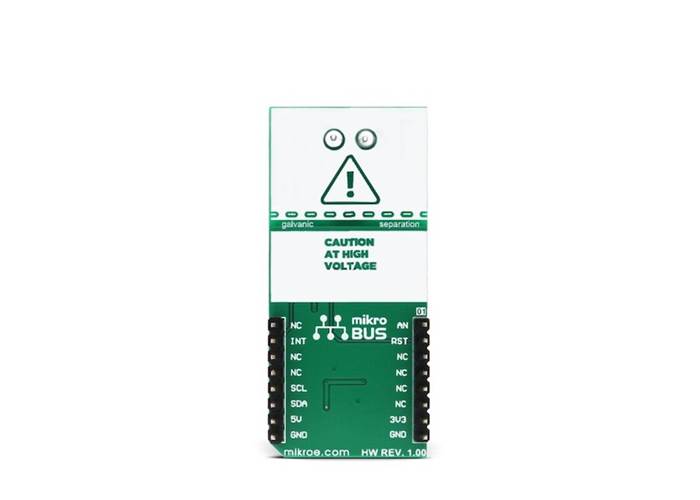 The ACS711 IC offers a galvanic isolation for up to 100V. A care should be taken when operating with high voltages, not to touch the Click board™.