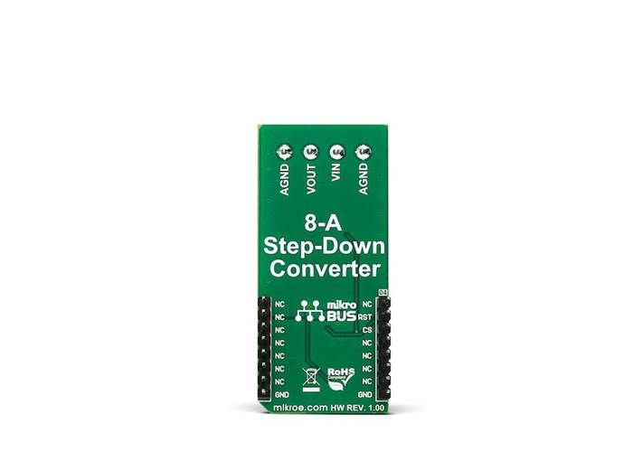 Buck 3 Click is a very advanced synchronous step-down (buck) converter, which is designed to deliver noise and ripple-free voltage to highly sensitive applications, such as FPGA and high-performance DSP platforms. The onboard step-down converter IC integrates low RDSON MOSFETs, that allow high efficiency, and thus high current on the output - up to 8A. Buck 3 operates at 800kHz, allowing an optimal balance between the efficiency and the size of the used components. DCM mode ensures that the efficiency is maintained even while working with light loads.