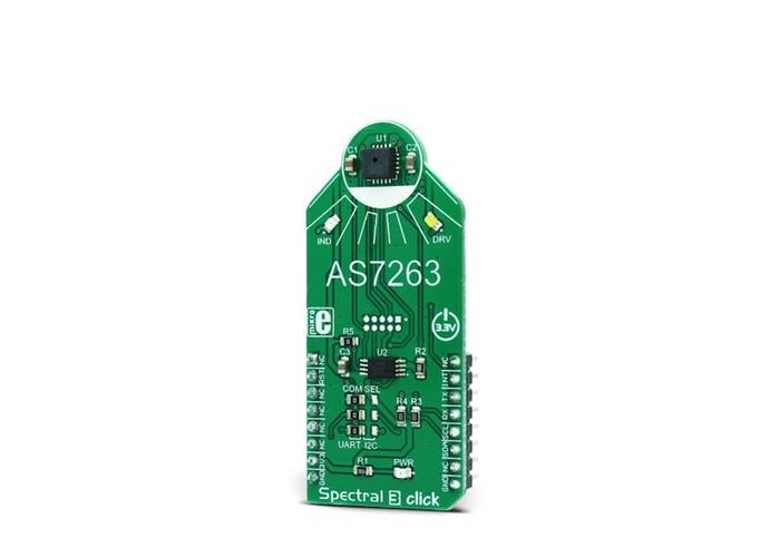 Spectral 3 Click is a multispectral sensing device, which uses the state-of-the-art sensor IC for a very accurate near-IR (NIR) sensing. The sensor on the Spectral 3 Click provides multi-spectral sensing in the NIR wavelengths from approximately 610nm to 860nm with the full width at half maximum (FWHM) of 20nm. Spectral 3 Click provides a direct reading of the six different channels with the 16bit precision, as well as the calibrated reading, that gives 32bit float values with an 8bit biased exponent and a 23bit fraction part, processed through the Spectral ID engine. The sensor also integrates two programmable LED channels with constant current drivers, useful for indication and for providing the backlight for the measured colour object.
