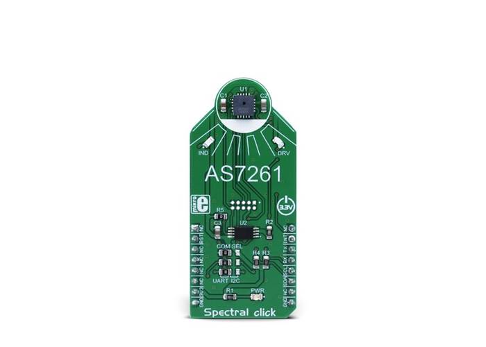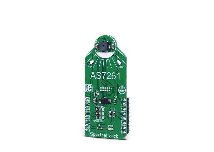Spectral Click is a multispectral light sensing device, which uses the state-of-the-art sensor IC for a very accurate chromatic white colour sensing. Spectral Click provides a direct reading of the XYZ colour coordinates, consistent with the CIE 1931 2° Standard Observer colour coordinates. It provides the mapping of the XYZ coordinates to the x, y (Y) coordinates of the two-dimensional colour gamut, and it scales them to the CIE 1976 u’v’ co-ordinate system. This Click board™ also provides accurate Correlated Colour Temperature (CCT) measurements and colour point deviation from the black body curve for white light colour, in u’v’ co-ordinate system. Additionally, Spectral Click features the Near-IR (NIR) wavelengths sensing channel, as well as two programmable LED channels with a constant current.