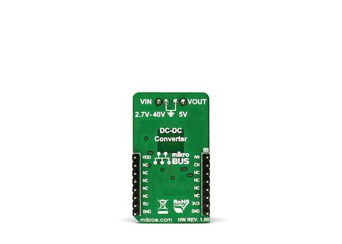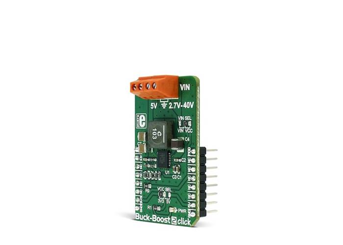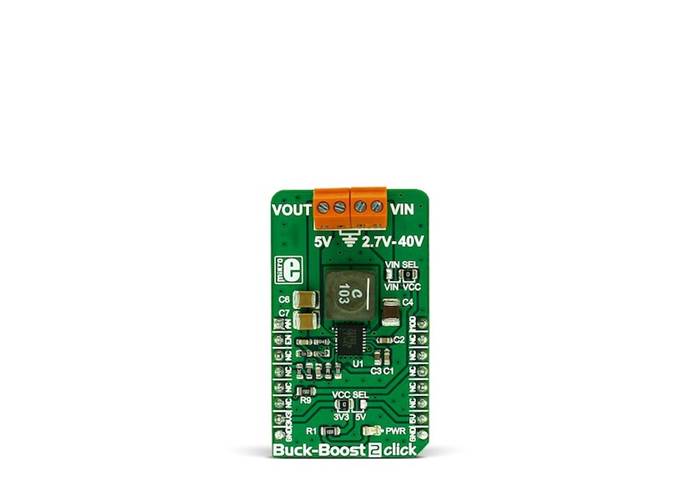 Buck-Boost 2 Click is an advanced DC-DC step-down/step-up regulator (buck/boost), which is able to provide regulated 5V on its output, regardless of the input voltage. The input voltage can range from 2.7V up to 40V.