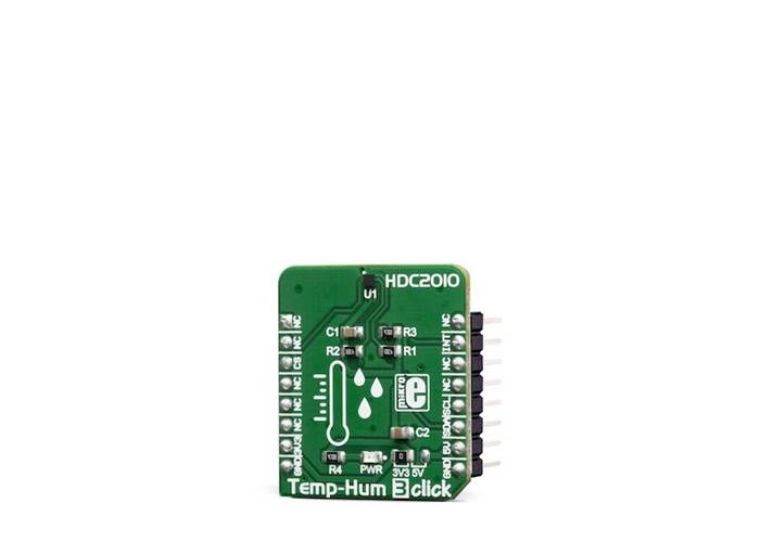 Temp&Hum 3 Click supports programmable interrupt engine, saving the host MCU from having to constantly poll the IC for data. An interrupt signal with a selectable polarity and behaviour can be generated on the DRDY/INT pin of the HDC2010. It can be triggered by several event sources: it can be triggered by the temperature Lo/Hi threshold events, Humidity Lo/Hi events, as well as the readiness status of the measurement data. Setting up the interrupts can be achieved by programming the appropriate IC registers via the I2C bus. More information about these registers can be found in the HDC2010 datasheet.