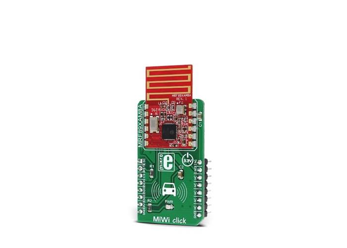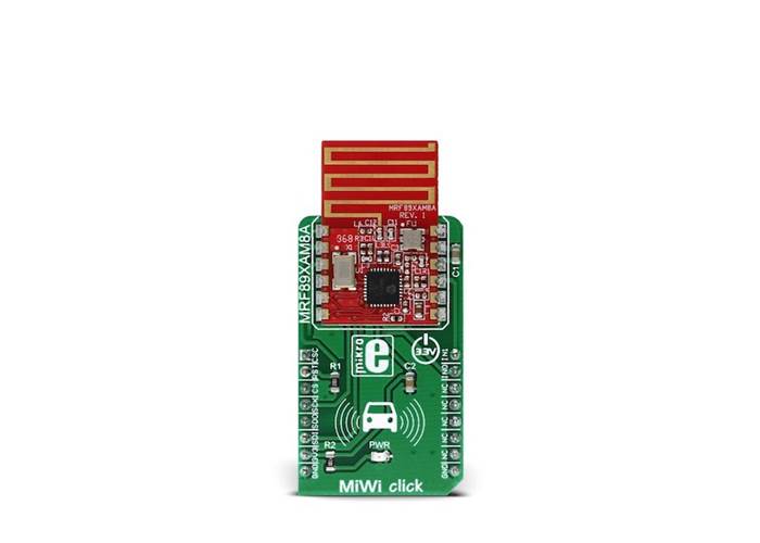 MiWi Click features the MRF89XAM8A, a compact low-power sub-gigahertz radio transceiver module from Microchip, that operates at a frequency range between 863MHz and 870MHz. This module has all the necessary components onboard, including a small trace PCB antenna and matching electronics, allowing compact design, while maintaining the flexibility. It supports OOK and FSK signal modulation with data rates limited to 16kbps and 40kbps respectively, in order to be compliant with the ETSI standards. The MRF89XAM8A module is based upon a base architecture of the generic MRF89XA module, with a few modifications, applied in order to make this module ETSI compliant.