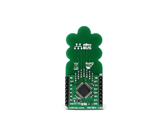 Onboard SMD jumper labelled as VCC SEL is used to select the power supply and logic voltage level. This Click board™ can work with both 3.3V and 5V MCUs.
