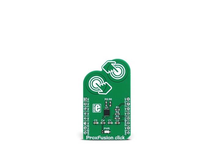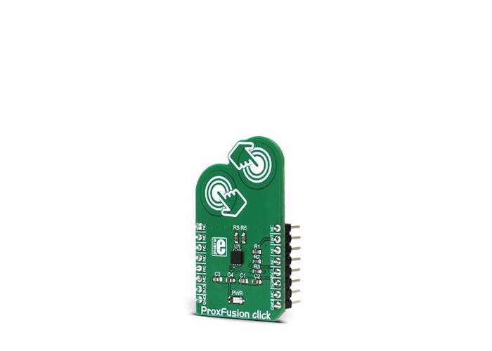 The integrated circuit, used on ProxFusion Click, allows a minimal number of external components, thus allowing the ProxFusion Click to work with a very low power consumption. The compact size and advanced onboard functions make this Click an ideal solution for implementing all kinds of advanced HMI interfaces, wearable devices, proximity activated or dimmed TFT backlight, digital angle gauges, and similar applications that include any kind of capacitive proximity/touch and Hall-effect sensing elements.