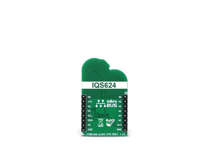 The design of the board is reasonably simple since the IC encompasses all the required components on the chip. The I2C bus lines are pulled up to 3.3V with the resistors, as well as the RDY pin from the IC, routed to the INT pin of the mikroBUS™. This pin can be used to report an event, when the device is set to work in the event mode, via I2C. Otherwise, this pin is used to indicate a communication window. After the host MCU initializes the communication by sending the valid I2C address of the IQS624 IC, it will respond with the ACK signal and the RDY pin will be pulled to a LOW logic state, to indicate an open communication window. I2C features a time-out that will reset the communication bus and the RDY pin, allowing MCU to use interrupts and break the I2C ACK signal polling loop.