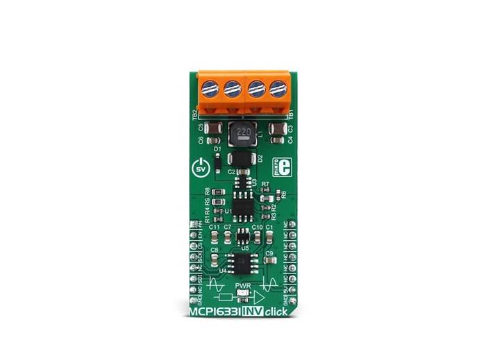 MCP16331 INV Click comes with two screw terminals, used to connect the input and the output voltage rails. This Click board™ uses only +5V rail from the mikroBUS™. Provided libraries demonstrate functionality of the MCP16331 INV Click and offer an easy and simple way of setting it up. The included example can be used as a reference for future designs