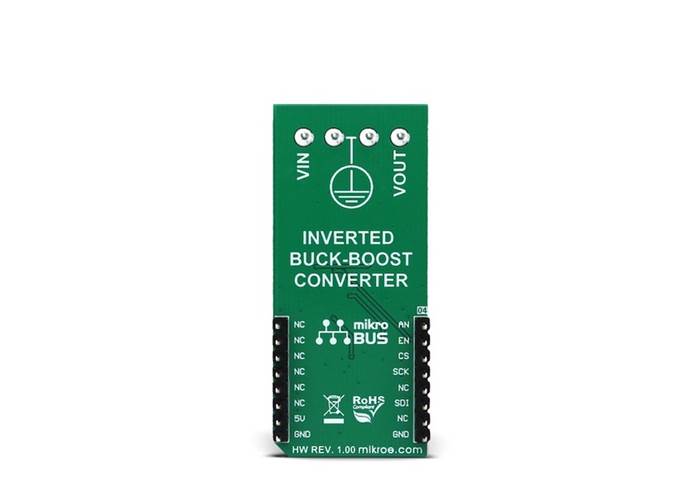 MCP16331 INV Click works as a buck-boost voltage regulator, a switching regulator topology that combines principles of the buck conversion (step-down) and the boost conversion (step-up). A buck converter outputs voltage that is smaller than the input voltage (steps down the input voltage).