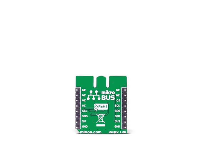 For the mikroBUS™ socket we include the MIKROE Weather Click. MIKROE Weather Click carries BME280 integrated environmental unit from Bosch. It’s a sensor that detects humidity, pressure, and temperature, specifically designed for low current consumption and long-term stability. The click is designed to work on a 3.3V power supply. It communicates with the target microcontroller over SPI or I2C interface.