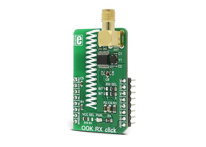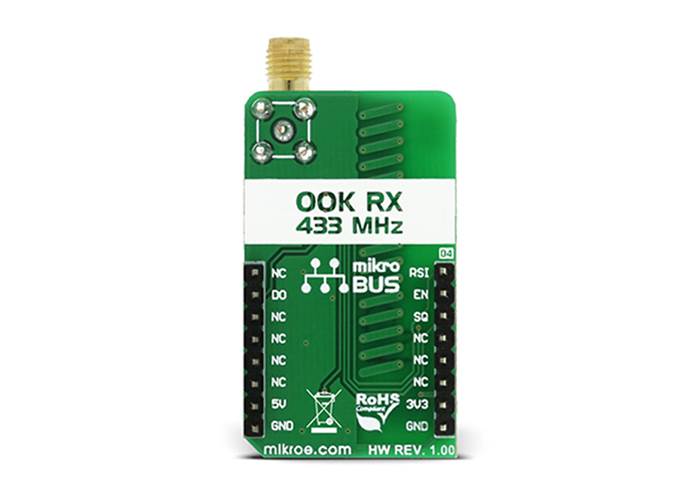 OOK RX Click can work both with an integrated PCB trace antenna or a 433MHz external antenna, which can be attached to the onboard SMA connector of the Click board™, for improved range and received signal strength.