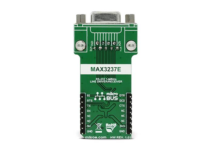 The integrated circuit used to provide an electrical interface between RS232 and UART on the RS232 2 Click is the MAX3237E, a 3V to 5.5V multichannel RS232, 1 Mbit/s line driver/receiver from Texas Instruments. This device allows communication at 1 Mbit/s and allows 5V logic levels, even when working with 3.3V power supply. However, there is an onboard SMD jumper that allows selection of power supply voltage between 3.3V and 5V, if there is a requirement.