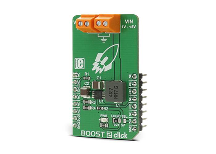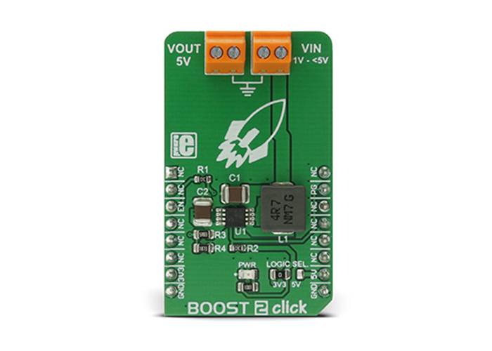 BOOST 2 Click is a DC-DC step-up (boost) regulator that has a fixed 5V output, which can be obtained from any low voltage input - such as NiCd, NiMH or one cell Li-Po/Li-Ion batteries.