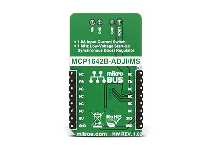 BOOST 2 Click utilizes the MCP1642B, a 1 MHz low-voltage start-up synchronous boost regulator from Microchip. This IC is targeted towards boosting the voltage from NiCd, NiMH, Li-Po/Li-Ion batteries and as such it has a great efficiency factor, that allows for prolonged battery life. The MCP1642B-ADJ IC uses the fixed switching frequency of 1MHz and has the overcurrent and overtemperature protection to ensure safe operation.