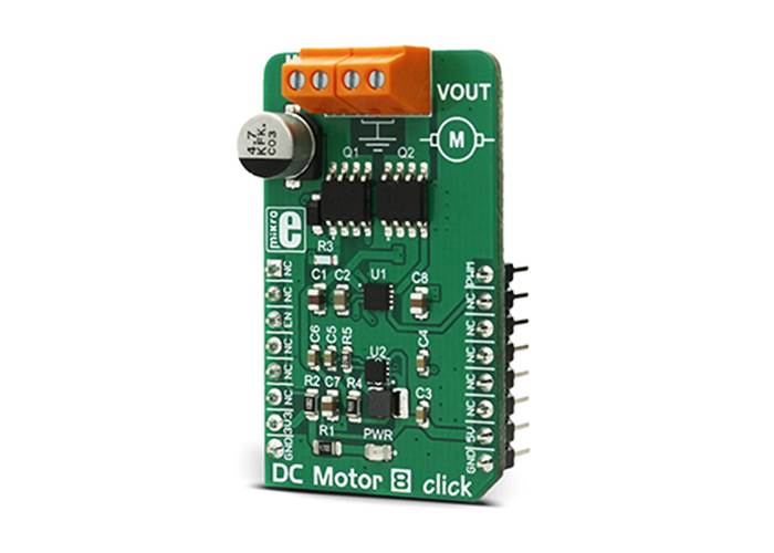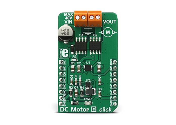 DC Motor 8 Click is a DC motor driver. It can drive simple DC motors with brushes, providing them with a significant amount of current and voltage up to 40V. The Click has one control input, that uses the PWM signal from the host MCU.