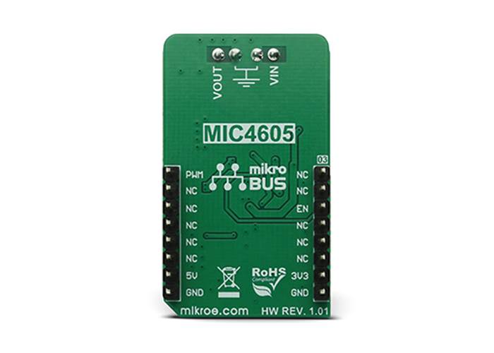 Besides the PWM pin routed to the mikroBUS™, the EN pin used to enable the device is also routed to the mikroBUS™ CS pin. Logic HIGH will set the device to work in normal mode, while LOW logic level will put the device into the power conservative shutdown mode. This pin is pulled HIGH with the onboard resistor.