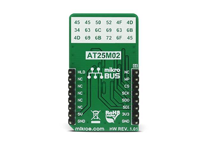 EEPROM 4 Click is 2,097,152 bits on a Click board™, organised into 262,144 bytes. In other words, this Click board™ is an EEPROM memory medium with the capacity of 256 KB. The used EEPROM module has very good endurance and it can withstand 1,000,000 write cycles, with the data retaining period of about 40 years. The EEPROM module on this Click can work with power supply voltage ranging from 1.7V to 5.5V, it features the self-timed write cycles, doesn’t require erase before writing, has a dedicated write protect pin for hardware protection of stored data, and has a dedicated hold pin used for holding the data transfer.