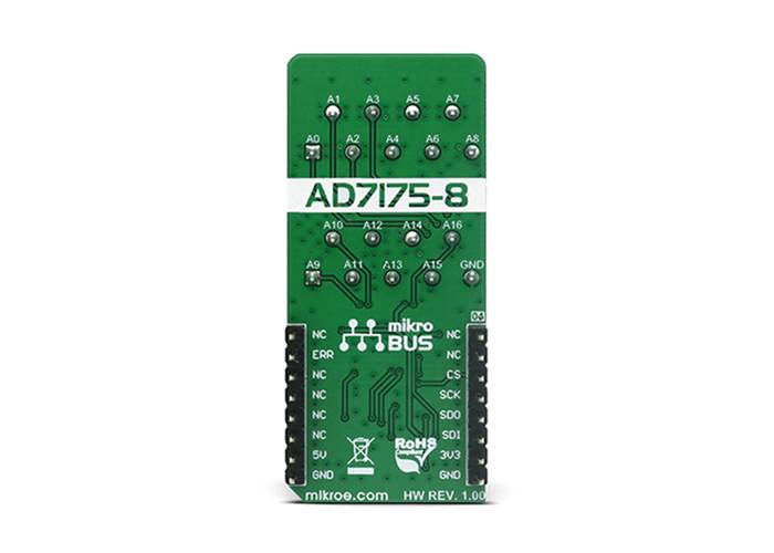 The main active component of ADC 4 Click is the AD7175-8 IC, a 24bit low noise, fast settling, multiplexed 8/16-channel sigma-delta analogue-to-digital converter from Analogue Devices. This integrated circuit allows for several different working modes and input connection configurations, giving a lot of flexibility to work with. Depending on the required precision, the ADC 4 Click can work in 16bit or 24bit mode. It can use single-ended connections with one common pin or differential pair connections, allowing for any combination between the two types of inputs.