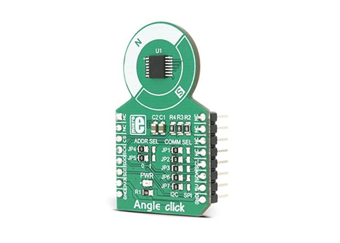 Angle Click is a precise Hall-effect angle sensing Click board™ that can be used to measure the rotational angle of the magnetic field in the X-Y plane above it (parallel to the surface of the Click), through the whole range of 360°.