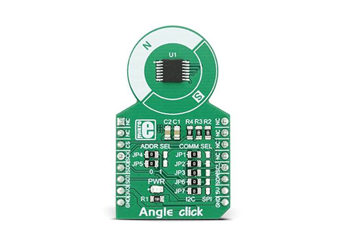 Angle Click is a precise Hall-effect angle sensing Click board™ that can be used to measure the rotational angle of the magnetic field in the X-Y plane above it (parallel to the surface of the Click), through the whole range of 360°. The Click yields very precise results for both off-axis and axis operation, which make it a perfect choice for precise measuring of the rotational angle in a wide range of different high-speed applications, for example in the automotive industry: electronic power steering, transmission, torsion bar, or the motor shaft rotation.