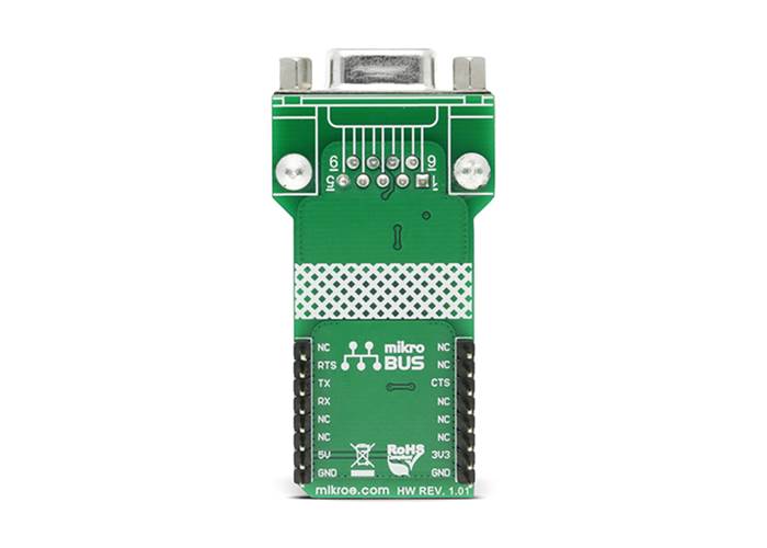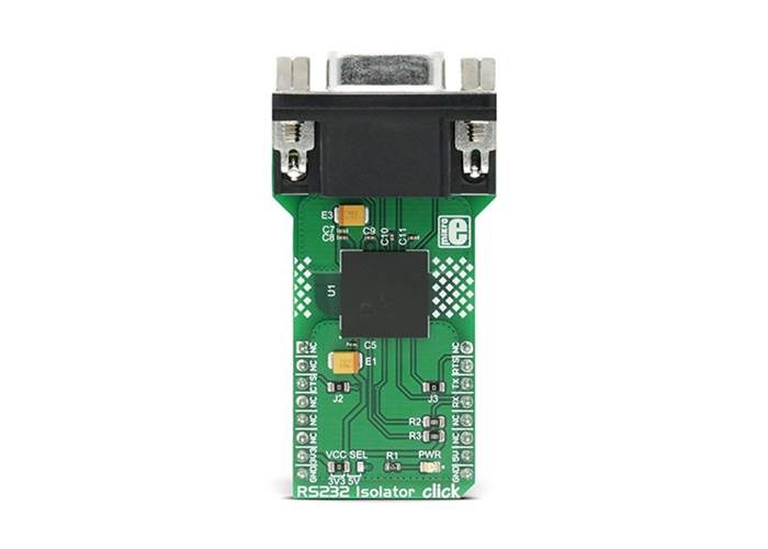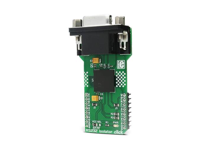 RS232 Isolator Click features the onboard D-Sub 9 (DE9) connector for an easy and secure connection.