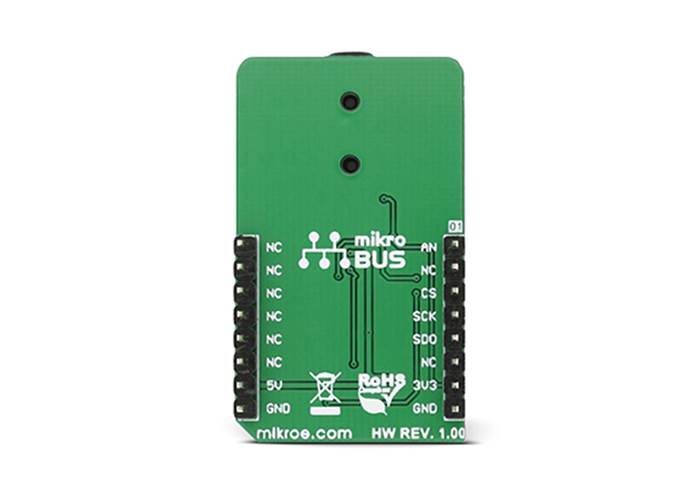 The onboard ADC IC uses the SPI for communication with the MCU. The SPI interface pins are routed to the appropriate mikroBUS™ pins. MCP3201 ADC also needs a clean and stable reference voltage, which is provided by the MCP1541, a small, 3-pin specialised reference voltage IC, from Microchip. The 5V rail is routed to the input of the voltage reference, as well as the VCC pin of the ADC IC and the OPAMP IC. This means that the Click board™ needs both 3.3V and 5V for a proper operation.