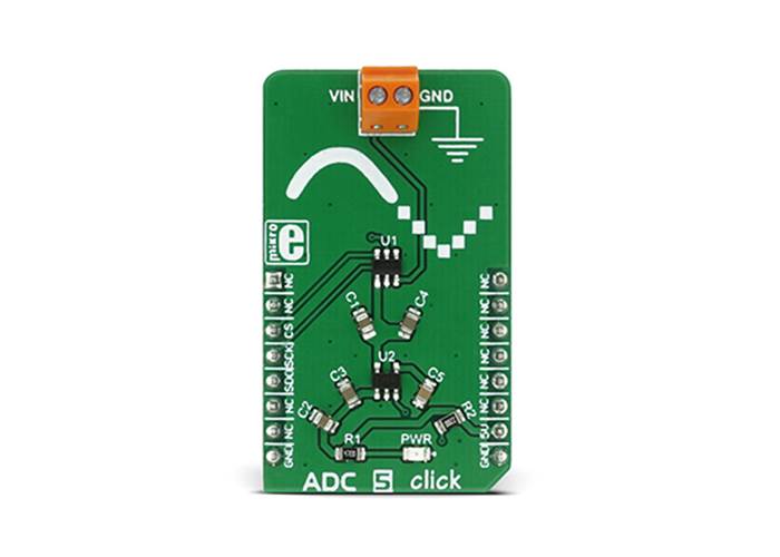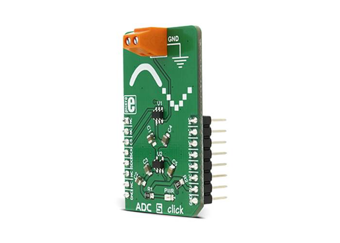 ADC 5 Click is a Click board™ used to sample an analogue voltage on the input and convert it to a digital information. ADC 5 Click is equipped with the ADC121S021, a low power, single channel 12-bit CMOS analogue to digital converter (ADC), with a high-speed serial interface.
