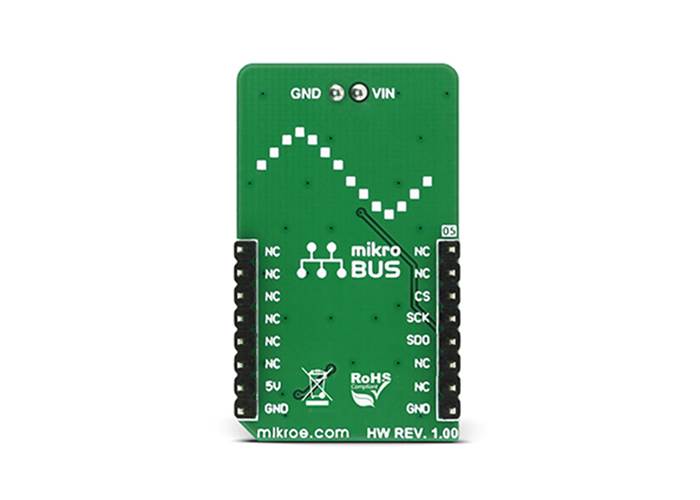 The device uses the SPI communication. The MOSI pin does not exist, since no communication from the MCU to the Click board™ is going on. The reading speed, also known as the sample rate, directly depends on the clock rate of the SCK line. The sample rate over which the specified electrical performance is ensured is 50 Ks/s to 200 Ks/s. The ADC121S021 has the ability to use any clock signal frequency up to the rated maximum frequency, with no significant deviations from the specifications stated in the datasheet: it is specified over a wide range of sample rates, maintaining a good linearity and high signal to noise ratio (SNR).