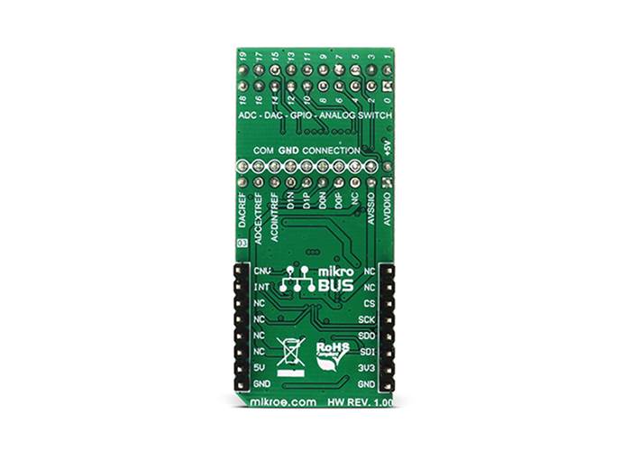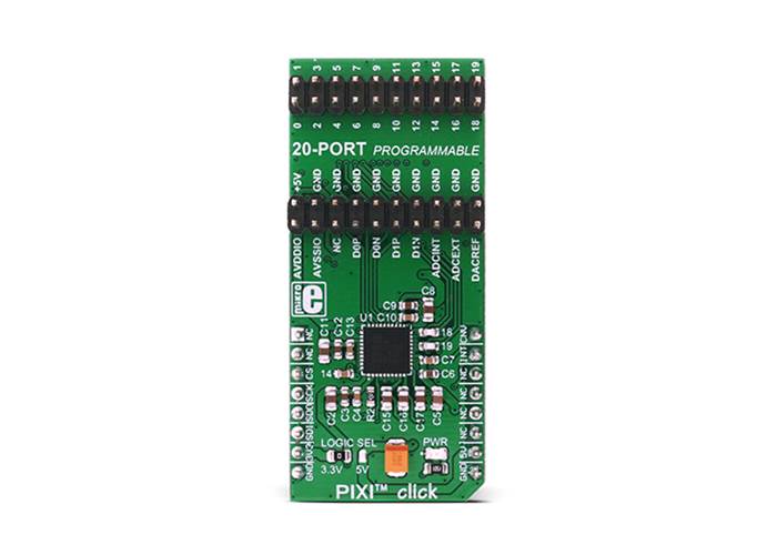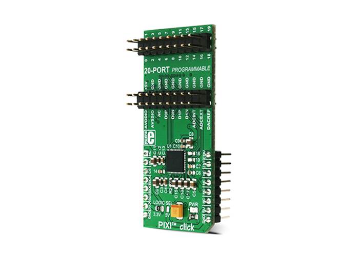 PIXI™ Click is equipped with MAX11300 IC from Analogue Devices, which features versatile, proprietary PIXI™ technology - it is the industry's first configurable 20-channel mixed-signal data converter.