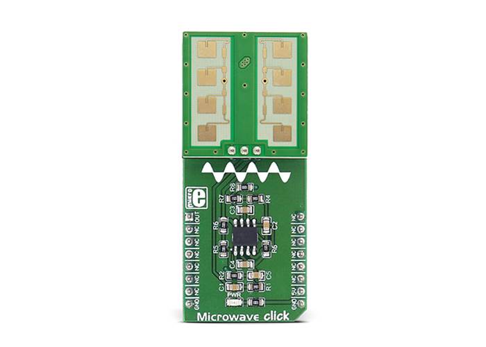 The PD-V11 microwave motion sensor picks up reflected waves and converts them to a voltage signal. This signal has the magnitude of several hundred microvolts, so it's sent to the MCP6022 which amplifies the signal, in order to make it readable over the Analogue pin on the mikroBUS™. This signal is amplified up to 3.3V.