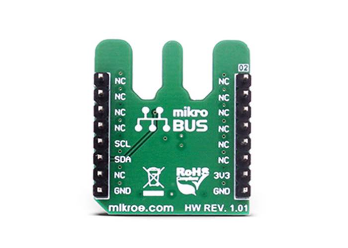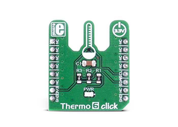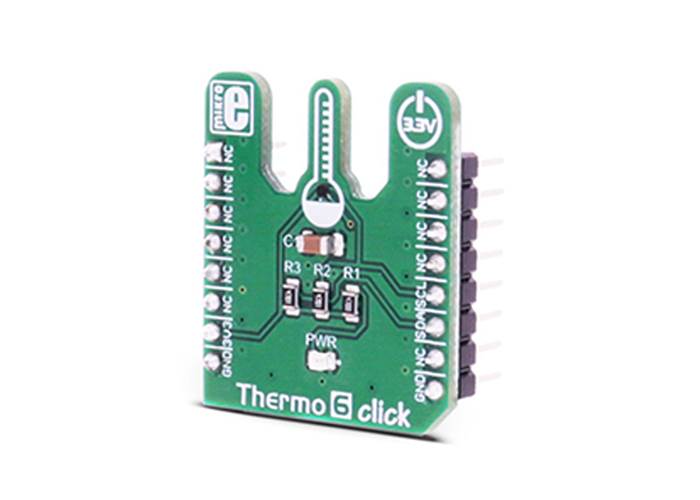 Small die dimensions of the sensor and the specially designed shape of the Thermo 6 Click PCB, ensure that there is a minimal interference from the surrounding components heat during the measurement of the ambient temperature. Pull-up resistors are included on the PCB of the Thermo 6 Click, so the device is ready to be used out of the box.