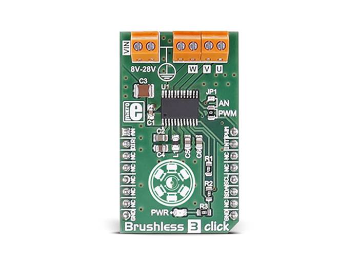 Brushless 3 Click carries the DRV10983, a three-phase sensorless motor driver with integrated power MOSFETs. When an external power supply is applied, you can drive a brushless DC motor through the PWM pin, AN pin or I2C interface.