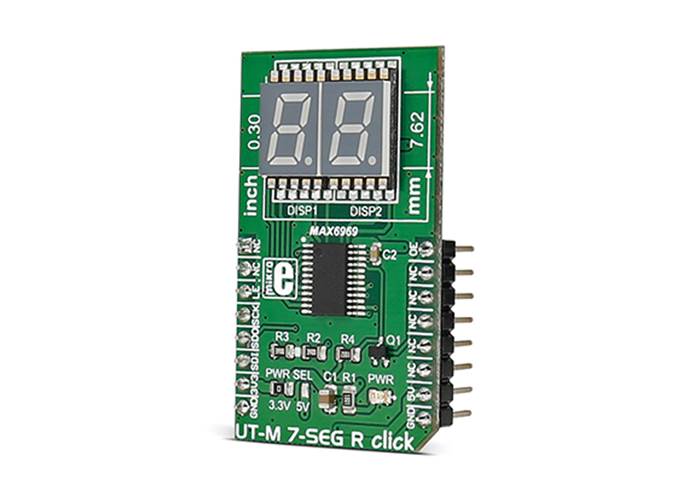 UT-M 7-SEG R Click carries two SMD ultra thin LED 7-SEG displays and the MAX6969 constant-current LED driver from Analogue Devices. The Click is designed to run on either 3.3V or 5V power supply. It communicates with the target microcontroller over SPI interface.