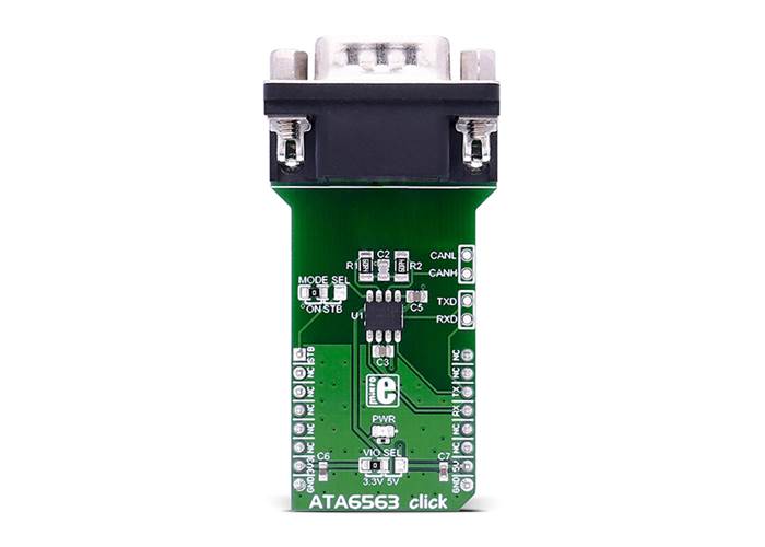 ATA6563 Click carries the ATA6563 high-speed CAN transceiver. The Click is designed to run on a 5V power supply. Use the VIO SEL jumper for selecting the 3.3V or 5V logic level.