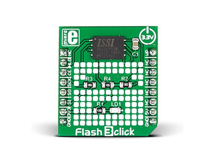Flash 3 Click is a mikroBUS™ add-on board for adding more Flash Memory to your target board microcontroller. It carries an ISSI IS25LP128 IC with 128 Mbit capacity.