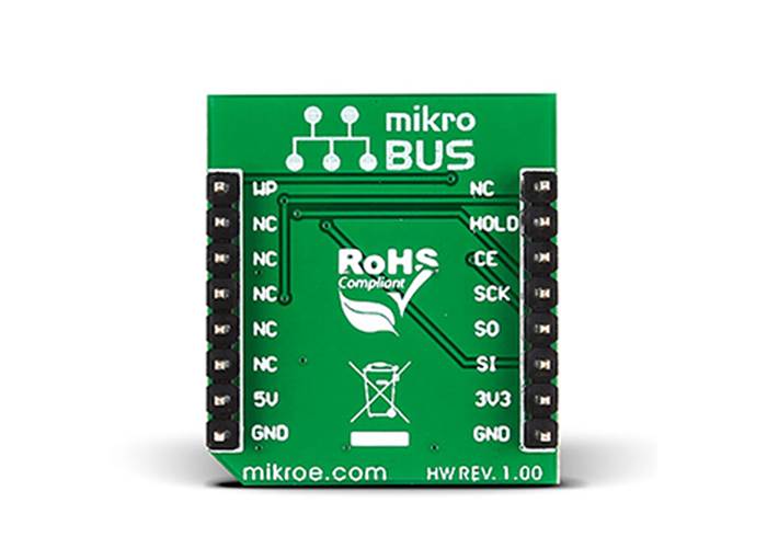 Flash 3 communicates with the target board through the mikroBUS™ SPI interface with additional functionality provided by HOLD, CE and WP pins. It is designed to use a 3.3V power supply only.