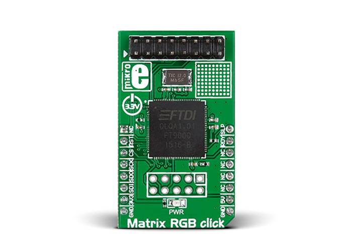Matrix RGB Click is a mikroBUS™ add-on board powered by a 32-bit FT900 MCU designed specifically for powering 16x32 RGB LED matrices. The board has a 16 wire IDC connector for connecting to a single 16x32 LED panel; however, the firmware inside the FT900x chip can drive more than one panel. Multiple panels can be connected to each other into a daisy-chain configuration (see the video). Matrix RGB Click communicates with the target MCU through the SPI interface. It uses a 3.3V power supply only.