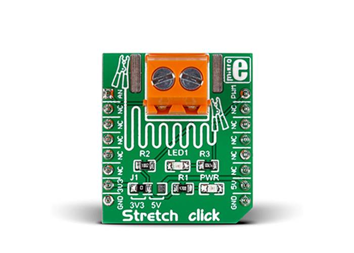 Stretch Click is a mikroBUS™ add-on board with circuitry for measuring stretch forces with conductive rubber cords. The Click has screw terminals for connecting 2mm-diameter conductive rubber cord. The resistance of the cord increases when stretched, impacting the voltage available on the AN pin. Stretch Click is designed to use either a 3.3V or 5V power supply.