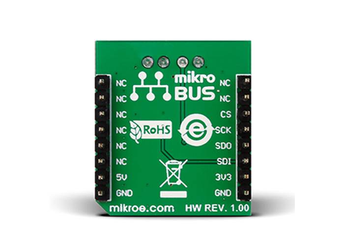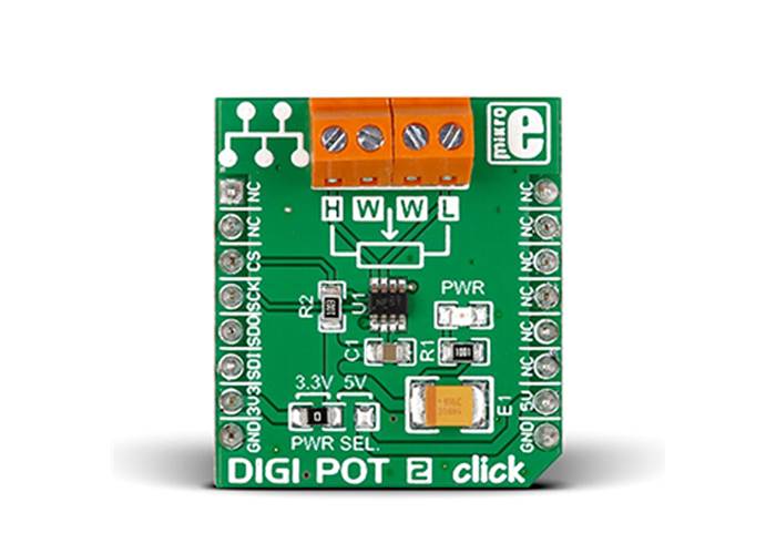 DIGI POT 2 Click is a mikroBUS™ add-on board with a single channel digital potentiometer TPL0501 with 256 wiper positions. The IC has 100 kilo Ohms end-to-end resistance, with ±20% tolerance. The board features two pairs of screw terminals for interfacing with the IC DIGI POT 2 Click communicates with the target MCU through the mikroBUS™ SPI pins (MISO, MOSI, SCK, CS). The board is designed to use either a 3.3 or a 5V power supply.
