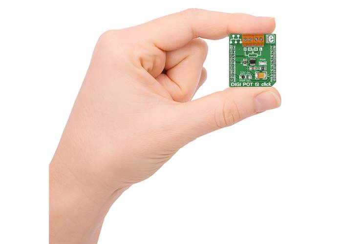 DIGI POT 2 Click is a mikroBUS™ add-on board with a single channel digital potentiometer TPL0501 with 256 wiper positions. The IC has 100 kilo Ohms end-to-end resistance, with ±20% tolerance.