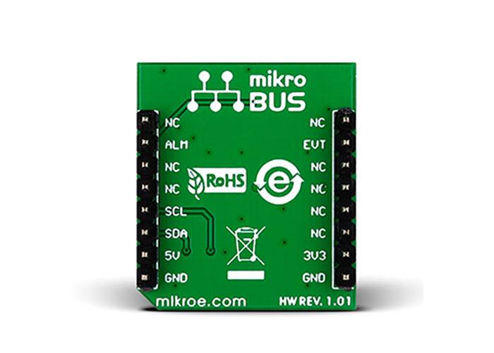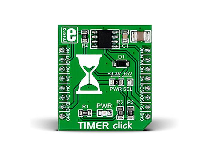 Timer Click is a mikroBUS™ add-on board with Analogue’s DS1682 total elapsed time recorder. The main feature of the IC is its elapsed time counter (ETC) used in conjunction with the ALARM pin. Whenever the EVENT pin is held high, the ETC will track time in quarter second resolution. Once the EVENT pin is set to logic low, the time data will be written in the IC’s non volatile EEPROM. The next time the EVENT pin is pulled high, the timer will pick up where it left and continue measuring accumulated time. The upper limit is 34 years. In practical applications, the ALARM pin will be utilised to set off a flag once a certain threshold of accumulated time is reached. The alarm flag is one time programmable. The board communicates with the target MCU through the mikroBUS™ I2C interface, with two additional pins: ALARM (in place of default INT) and EVENT (in place of RST). Designed to use either a 3.3V or a 5V power supply only.
