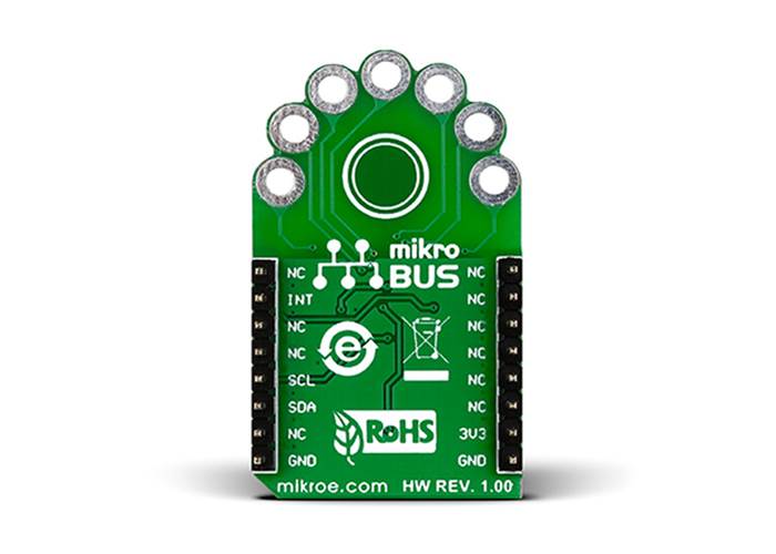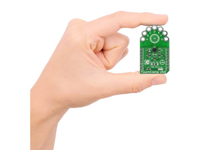 TouchClamp Click is a mikroBUS™ add-on board with NXP’s MPR121 proximity capacitive touch sensor controller. It has seven plated holes for clamps which can be used to connect any – literally any – conductive object in order to use it as an input button to send an interrupt to the target board MCU.