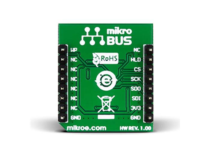Featuring high data transfer speed via the SPI interface, the improved reliability of the stored information, one time programmable (OTP) memory block, write protect and suspend, this Click board™ can be used as a mass storage option in multimedia devices, data drives, non-volatile data storage in embedded applications, and similar applications that require reliable permanent storage of data blocks. Addition of 2 KB of one-time programmable (OTP) memory can be useful for building secure storage devices and similar secure storage applications.