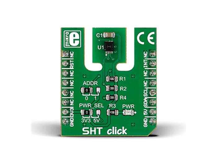 SHT Click is a temperature and humidity sensing Click board™ that carries Sensiron’s SHT3x-DIS IC. Compared to its predecessor (SHT11), SHT3x Click has increased reliability and enhanced signal processing features with a high signal-to-noise ratio.