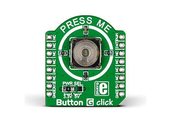 Button G Click is the simplest solution for adding a single pushbutton to your design. The button itself is transparent, 6.8mm in diameter and has a green LED backlight. When pressed, it sends an interrupt signal to the target board microcontroller.