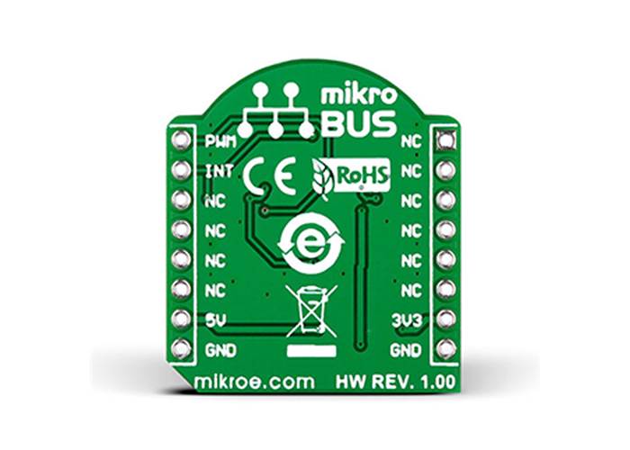 Button G Click is the simplest solution for adding a single pushbutton to your design. The button itself is transparent, 6.8mm in diameter and has a green LED backlight. When pressed, it sends an interrupt signal to the target board microcontroller. The backlight LED is controlled separately through the mikroBUS PWM pin, so you can program all kinds of patterns (varying level of light intensity or rate of blinking on subsequent button presses). The board can use either a 3.3V or a 5V power supply.