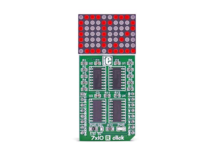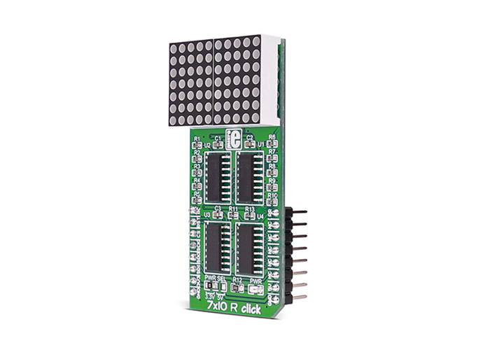 7x10 R Click is a LED dot matrix display Click, which can be used to display graphics or letters in a very simple and easy way. The Click board™ has two LED dot matrix modules with 7x5 stylish, round, dot-like LED elements.