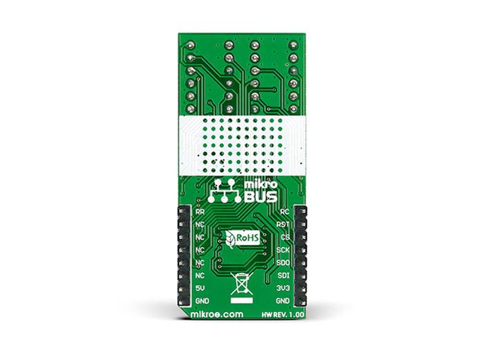 The #MR pin is used to clear the data in the internal storage register of the ICs. The LOW logic level on this pin will clear the content of this register but will not turn off the outputs already activated. The #MR pin is routed to the RST pin of the mikroBUS™ and it is pulled to a HIGH logic level by the onboard resistor.
