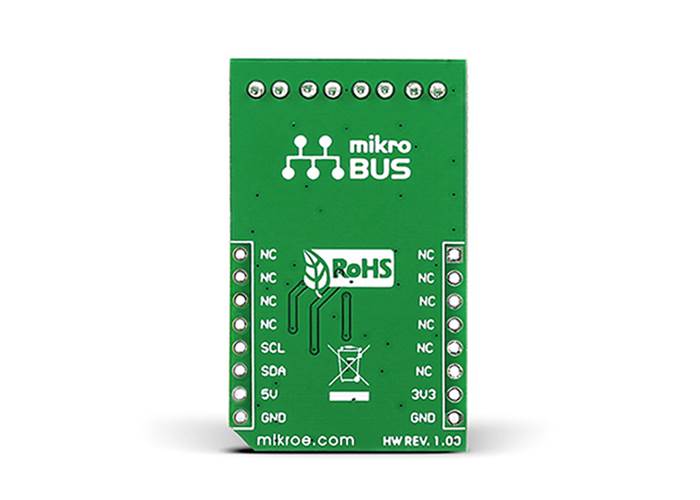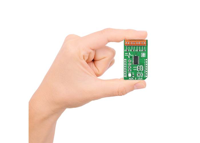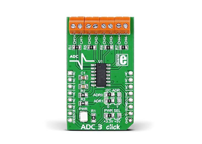 ADC3 Click carries Microchip’s MCP3428 16-bit multichannel analogue-to-digital converter. The Click has four pairs of screw terminals onboard, letting you access the chip’s four differential input channels.