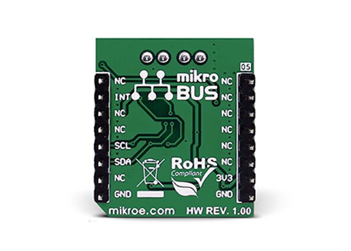 THERMO 5 Click measures temperature in default range of 0°C to 127°C and extended range of -64°C to 191°C with ±1°C accuracy. It carries the EMC1414 temperature sensor. The Click is designed to run on a 3.3V power supply. THERMO 5 Click communicates with the target microcontroller over I2C interface, with additional functionality provided by the INT pin on the mikroBUS™ line.